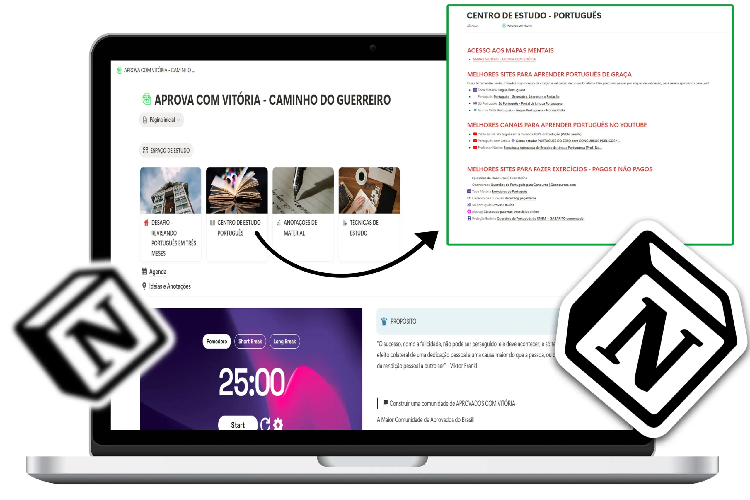 Com nosso Notion de organização + o Desafio Revisando Português em 3 meses, você integra o estudo de todos os mapas mentais em um ciclo de revisão inteligente, onde saberá exatamente o que estudar e quando revisar.